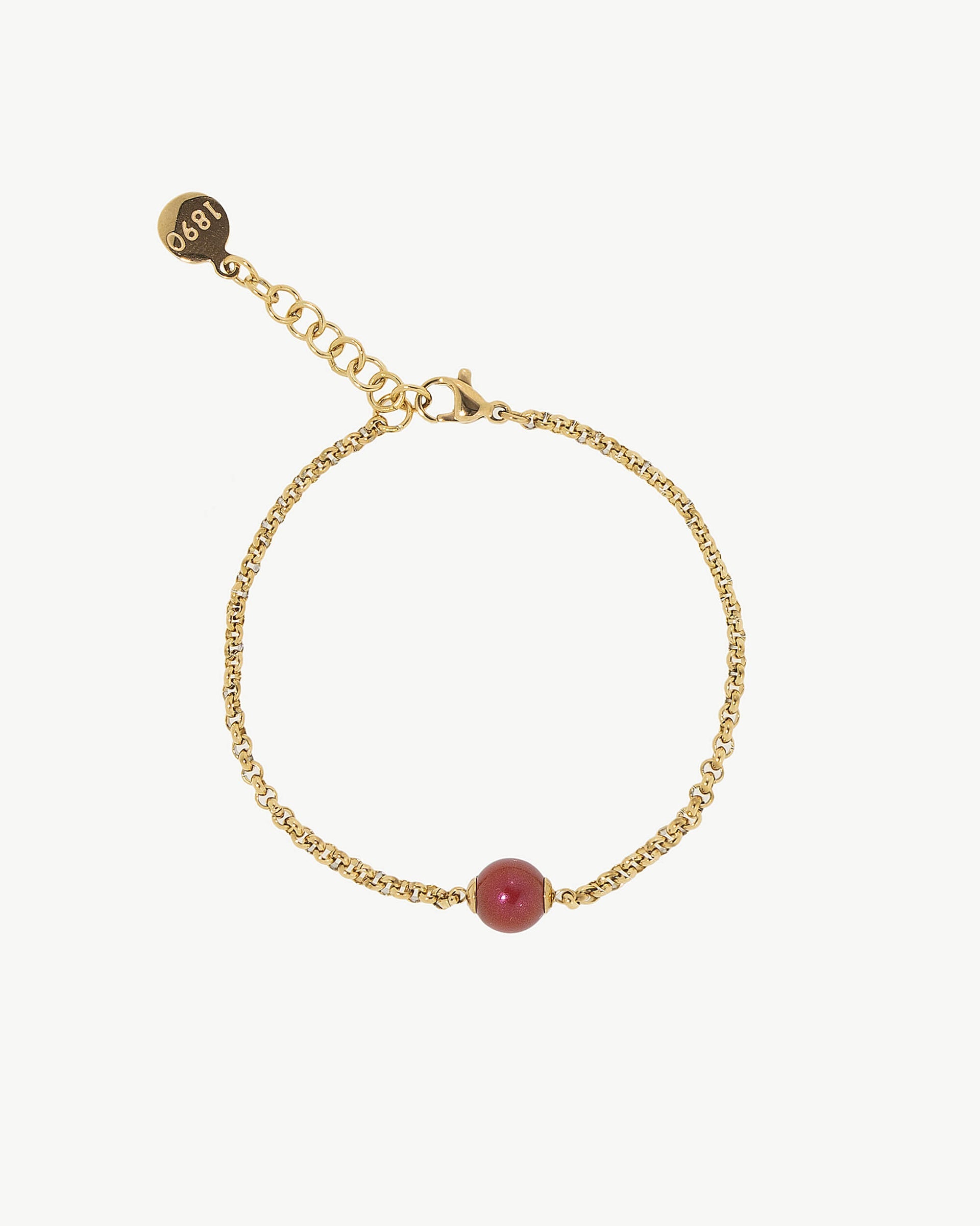 16 cm long chain bracelet in gold steel with 8mm round red pearl. Its design provides a fresh and versatile air, allowing you to express your personal style for any occasion.