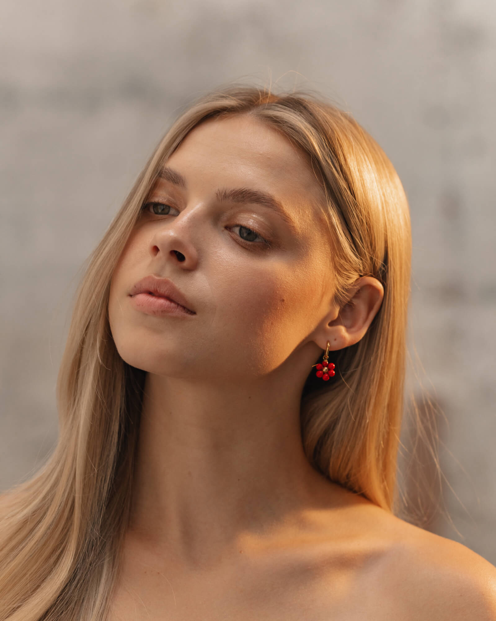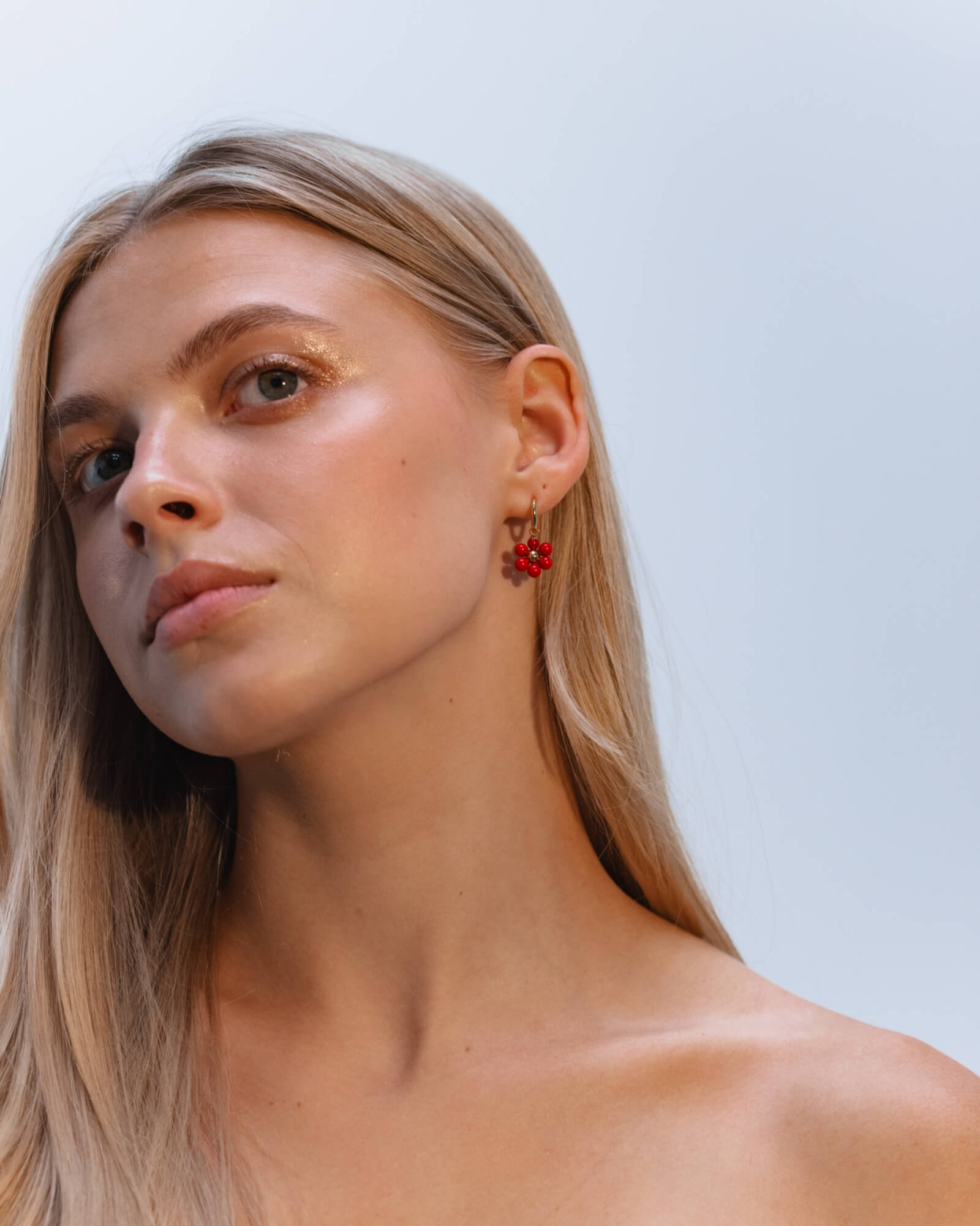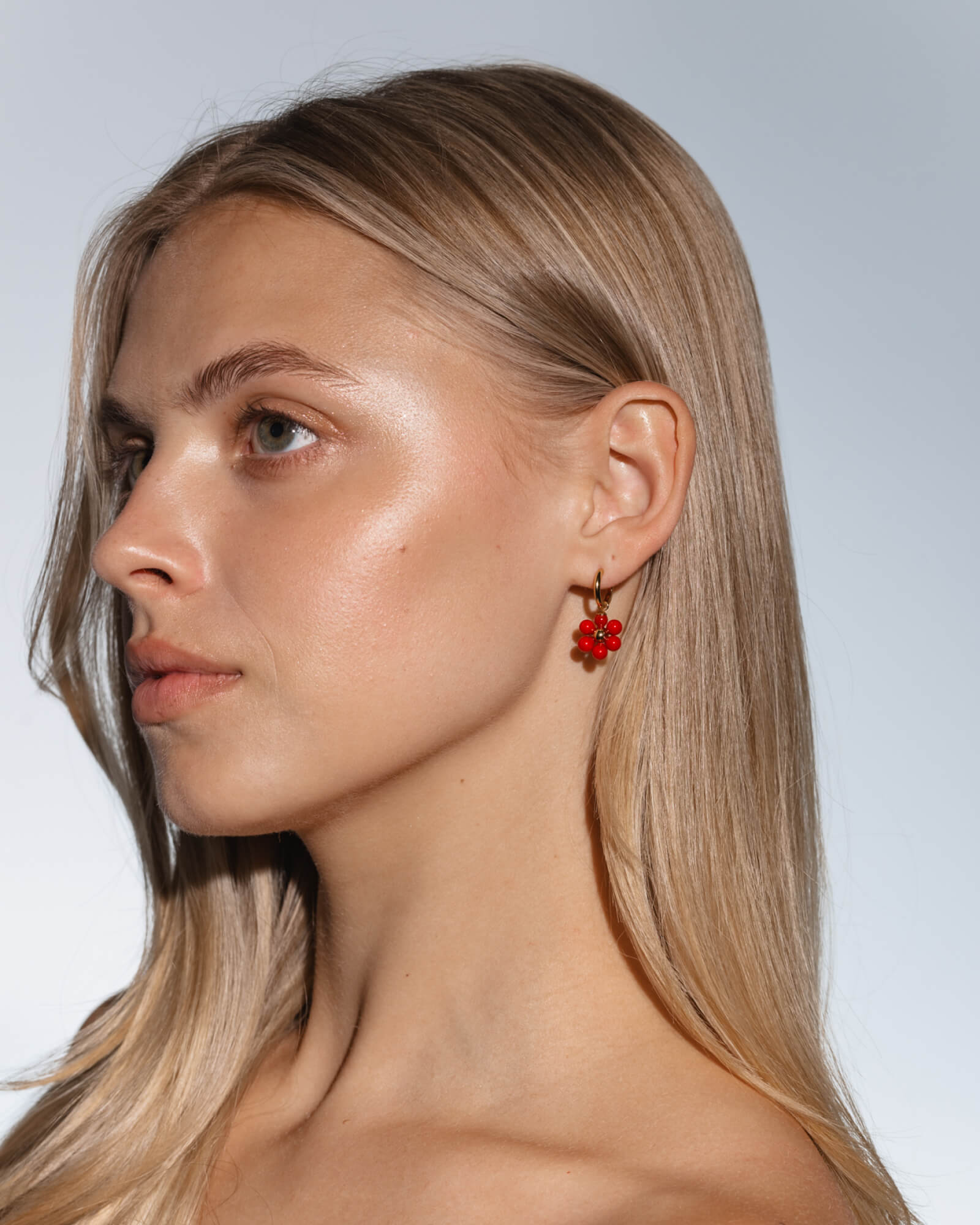 Mini hoop in golden silver with red and golden flower in 4mm round red pearls. Majorica flower-shaped brooches from the 1940s inspire new collections