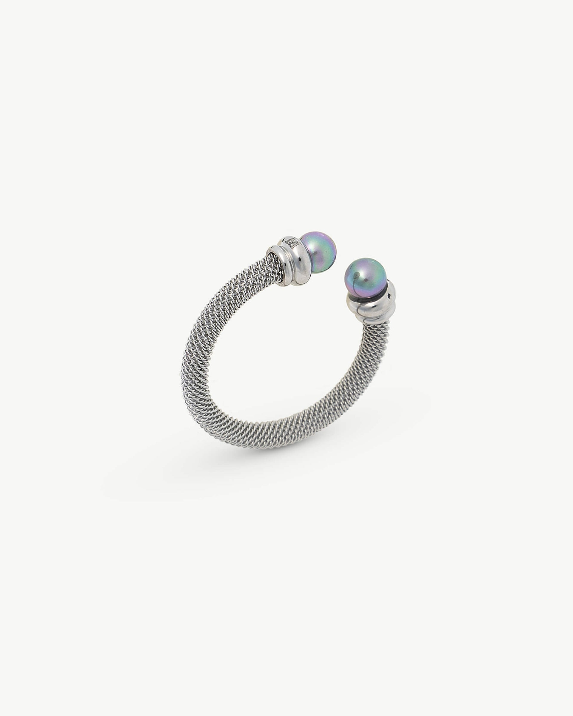 Open ring in steel with 4mm gray round pearls.For this collection of bracelets, rings and earrings, made of high-quality steel and adorned with pearls, each piece has been created to combine the sobriety of steel with the timelessness of pearls.Open ring in steel with 4mm gray round pearls. For this collection of bracelets, rings and earrings, made of high-quality steel and adorned with pearls, each piece has been created to combine the sobriety of steel with the timelessness of pearls.Open ring in steel with 4mm gray round pearls. For this collection of bracelets, rings and earrings, made of high-quality steel and adorned with pearls, each piece has been created to combine the sobriety of steel with the timelessness of pearls.