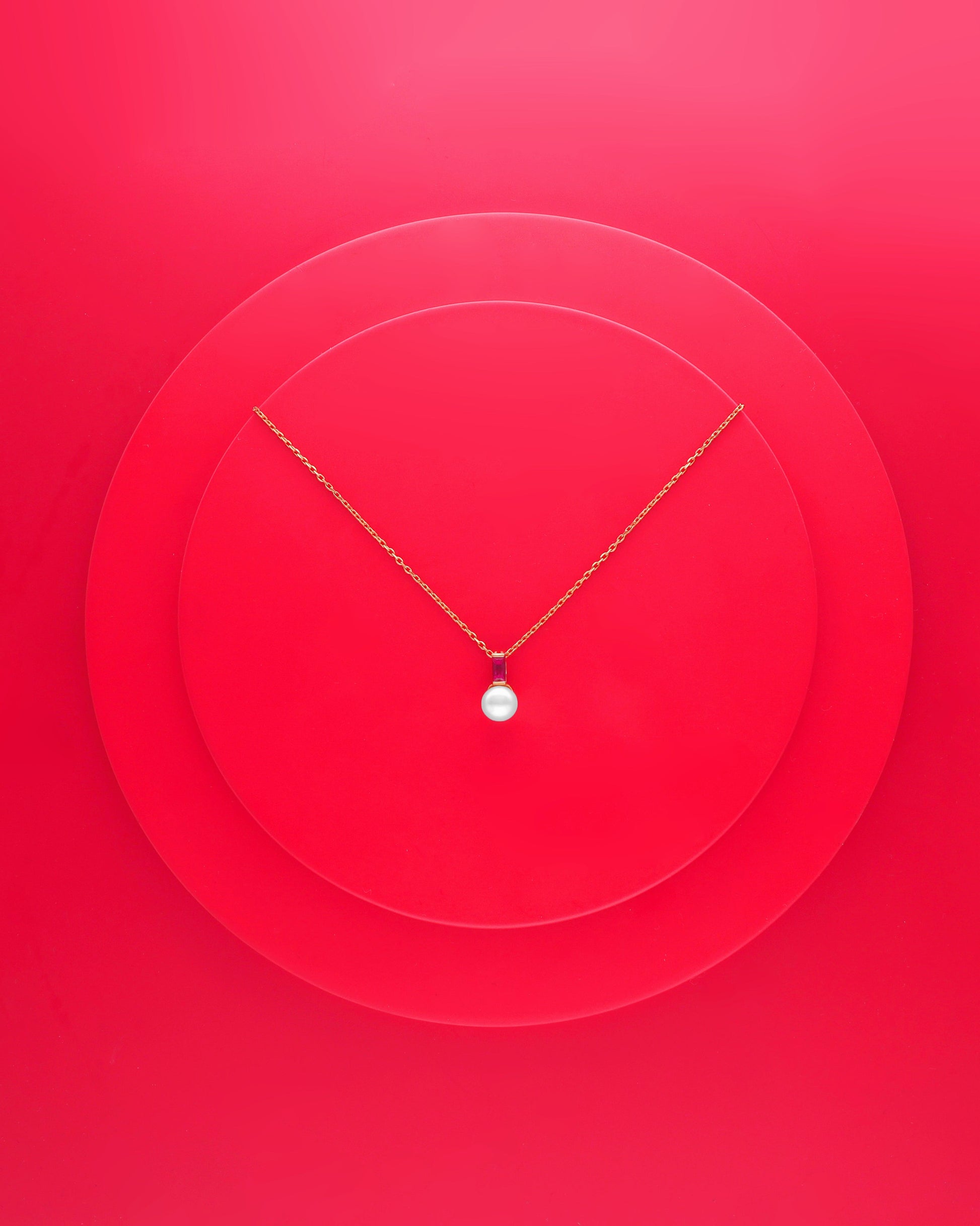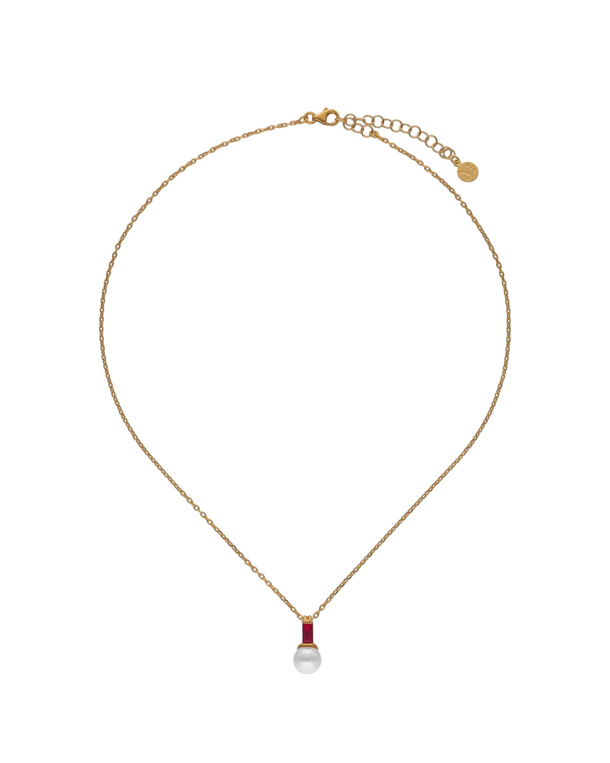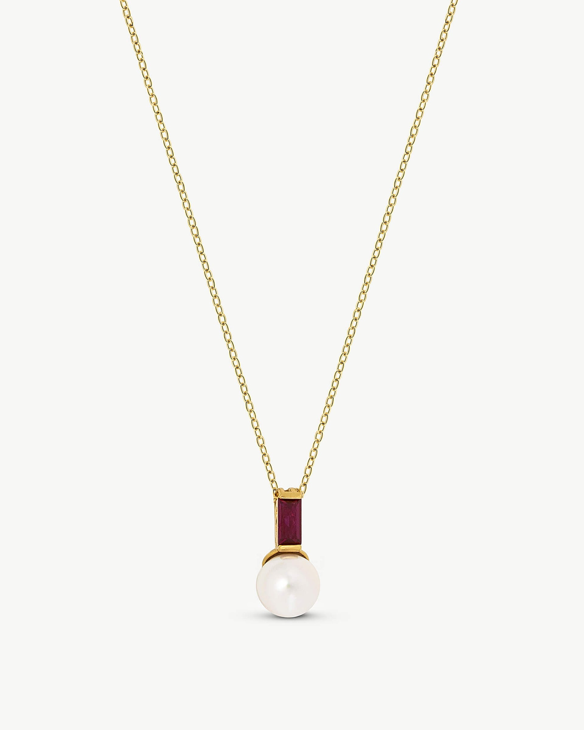 Pendant with chain in golden silver. 8mm white round pearl and ruby red zircon. Jewelry for your daily life.Pendant with chain in golden silver. 8mm white round pearl and ruby red zircon. Jewelry for your daily life.Pendant with chain in golden silver. 8mm white round pearl and ruby red zircon. Jewelry for your daily life.