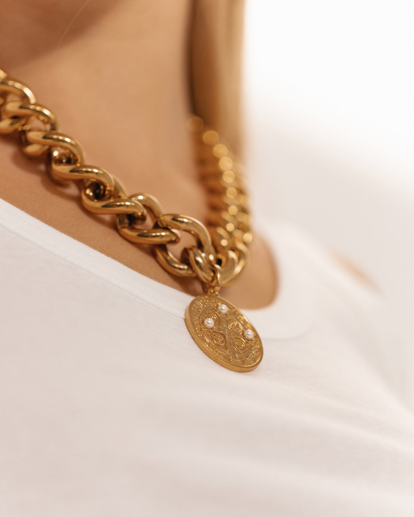 San Benito charm in gold-plated steel and 3mm pearls. Stunning chain necklaces and bracelets are accompanied by medals and talismans with different meanings. In the great universe of fashion, talismans and amulets have emerged not only as accessories of great beauty and individuality, but also as objects of profound meaning. Today, they have returned to being used as jewellery, mainly attached to a pearl necklace or a chain.San Benito charm in gold-plated steel and 3mm pearls. Stunning chain necklaces and bracelets are accompanied by medals and talismans with different meanings. In the great universe of fashion, talismans and amulets have emerged not only as accessories of great beauty and individuality, but also as objects of profound meSan Benito charm in gold-plated steel and 3mm pearls. Stunning chain necklaces and bracelets are accompanied by medals and talismans with different meanings. In the great universe of fashion, talismans and amulets have emerged not only as accessories of great beauty and individuality, but also as objects of profound me