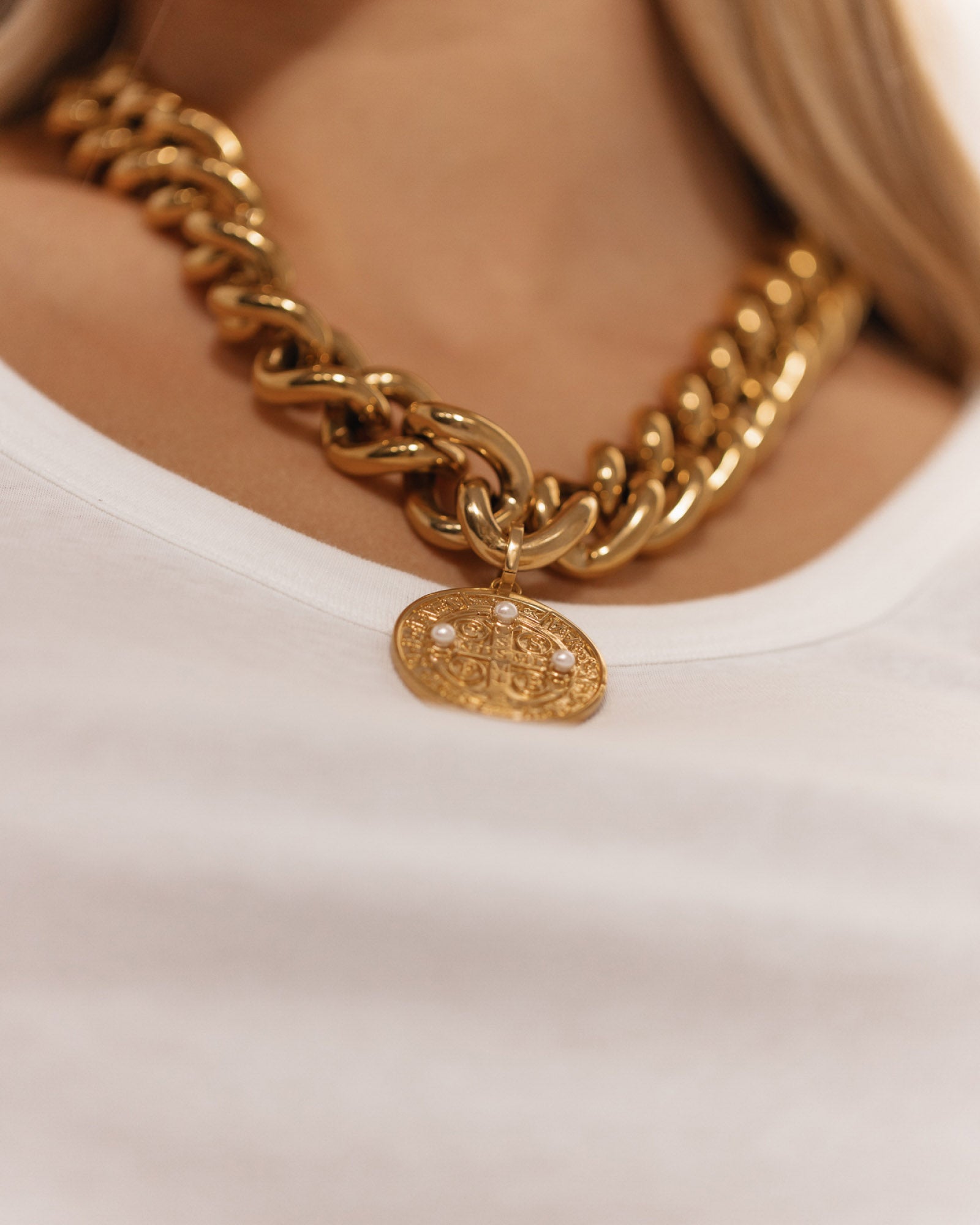 San Benito charm in gold-plated steel and 3mm pearls. Stunning chain necklaces and bracelets are accompanied by medals and talismans with different meanings.