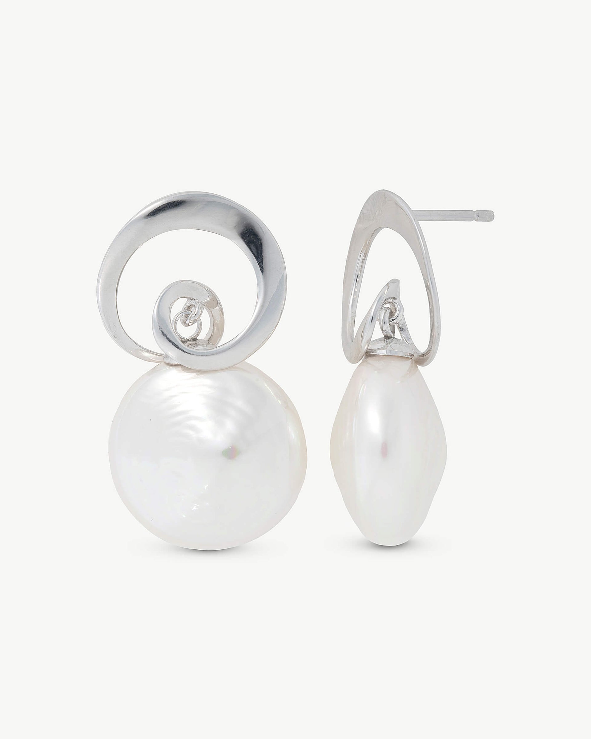 Short spike earrings in rhodium-plated silver, 18mm white bombshell oval pearls. In , circles and turns to enhance the natural beauty of the pearl in a collection of jewelry made in silver and made up of an ideal set earrings and a necklace with a pearl pendant.