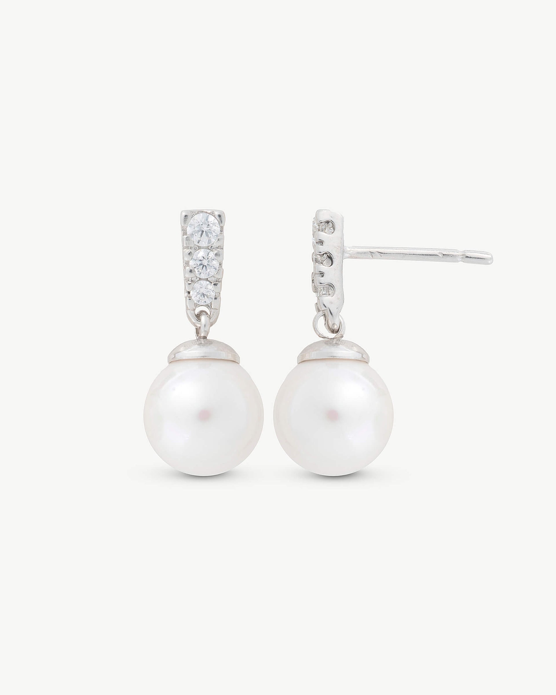 Short spike earrings in rhodium-plated silver, 8mm white round pearls and zircons. The perfect collection makes it the perfect couple.