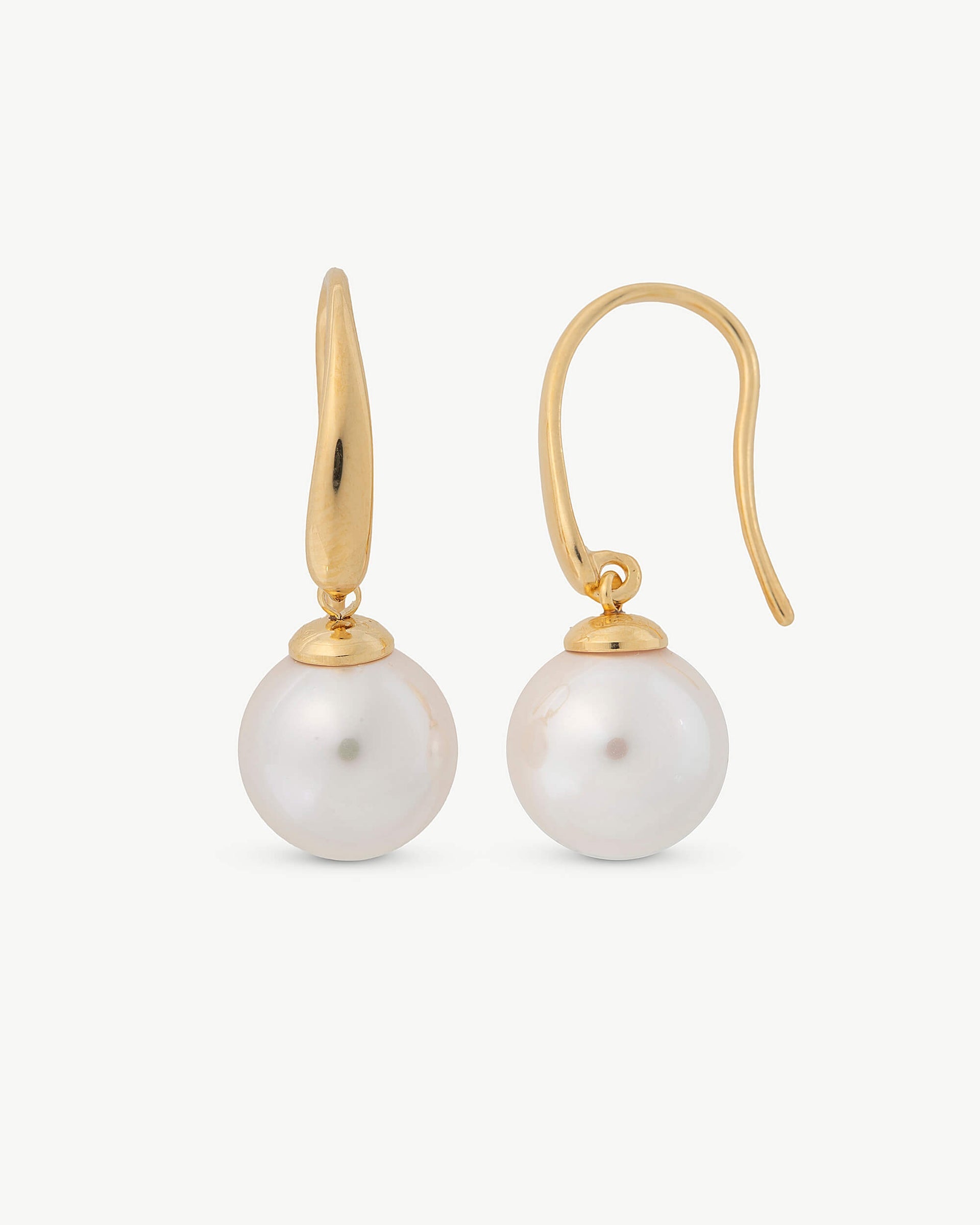 Short earrings, with hook closure, in golden silver, and 10mm white round pearls. Its design provides fresh and versatile air, allowing you to express your personal style for any occasion.