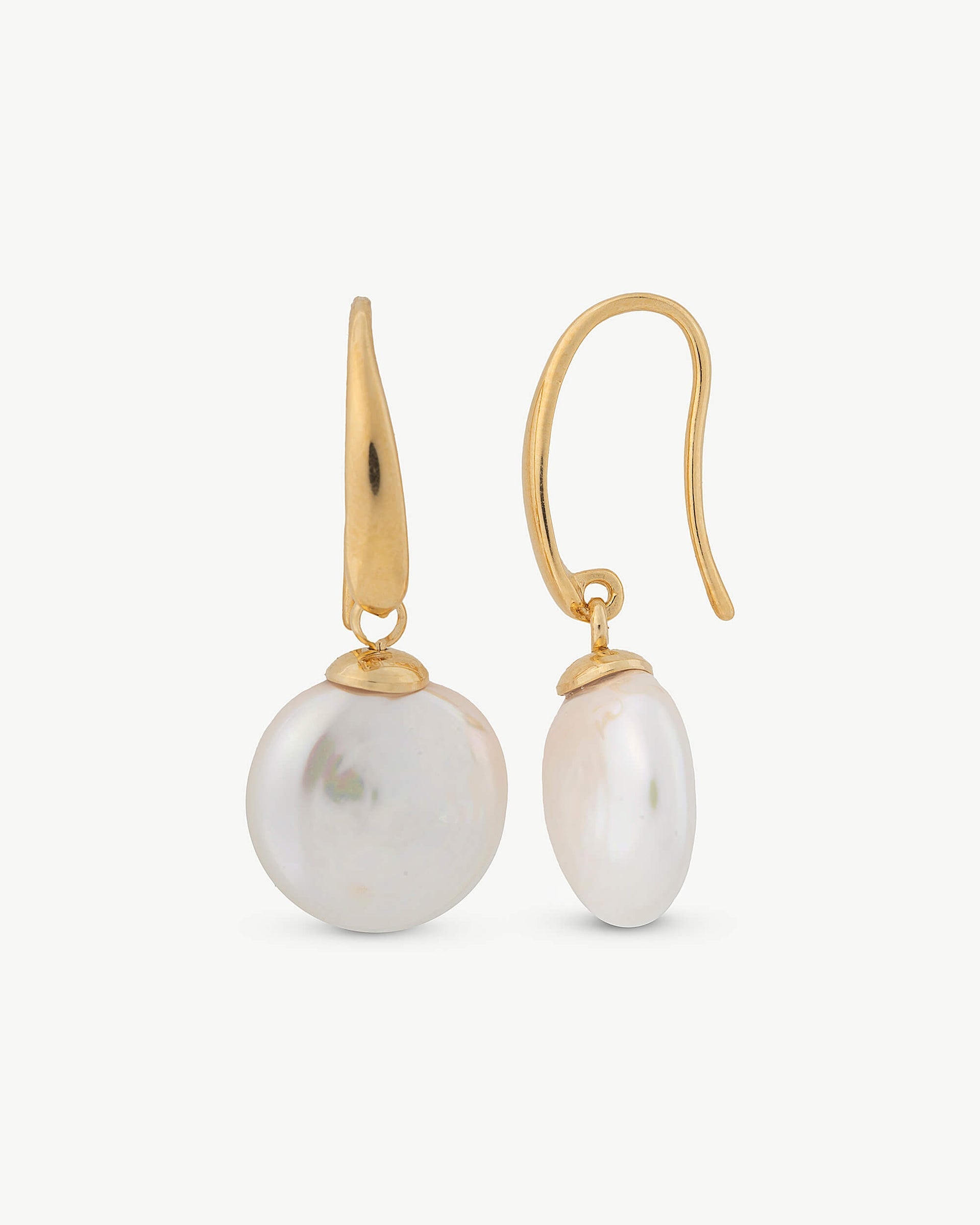 Short hook earrings. Made of gold-plated silver, with 12mm white pill-shaped pearls. Its design provides fresh and versatile air, allowing you to express your personal style for any occasion.