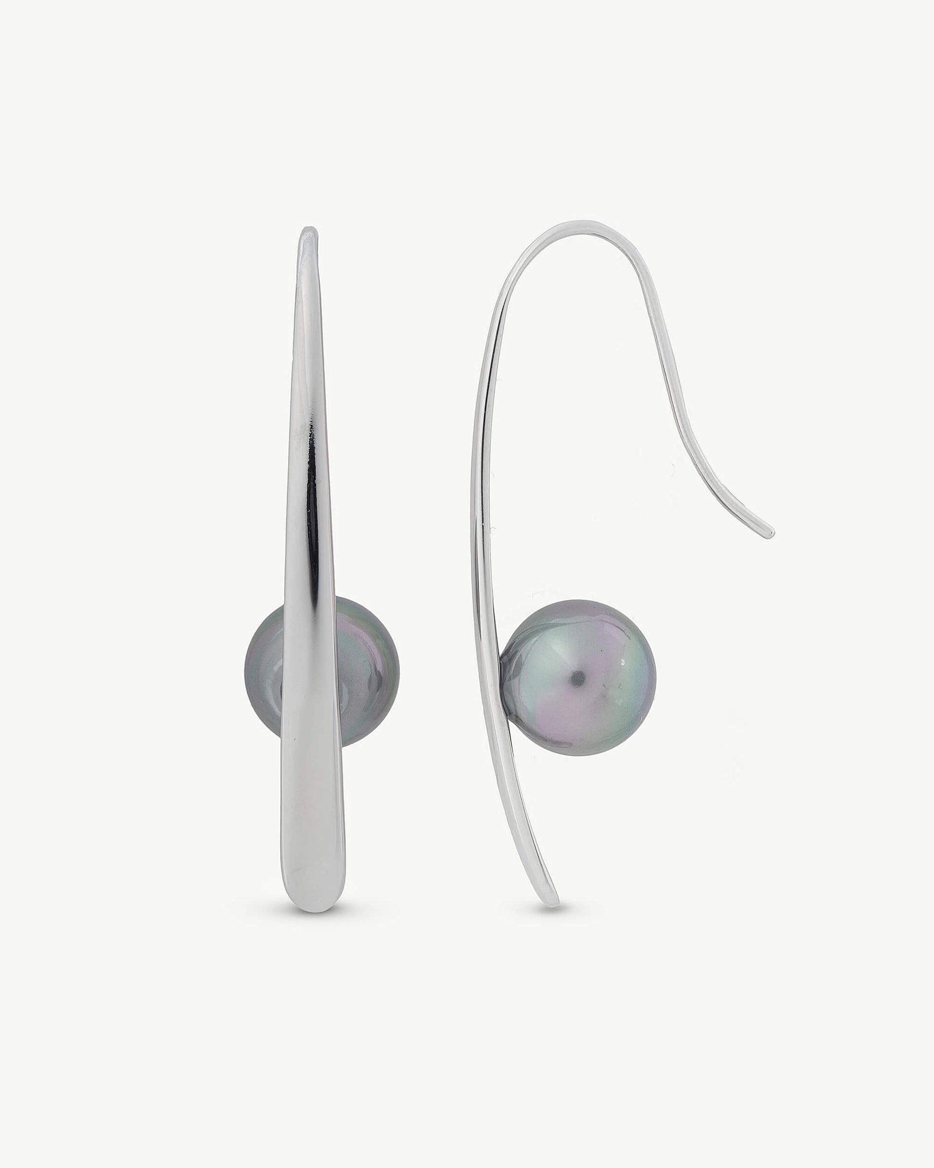 Long hook earrings in rhodium-plated silver, 10mm gray round pearls. A collection like from another planet.Long hook earrings in rhodium-plated silver, 10mm gray round pearls. A collection like from another planet.Long hook earrings in rhodium-plated silver, 10mm gray round pearls. A collection like from another planet.