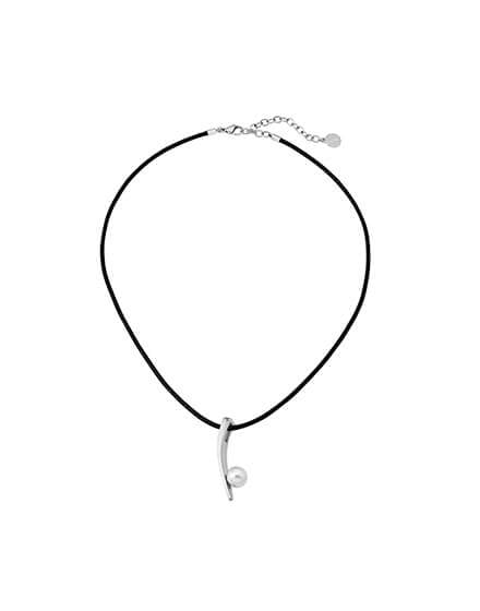 Short black leather necklace measuring 4349cm. with closure and decorations in rhodium-plated steel. With a 10mm white round pearl.