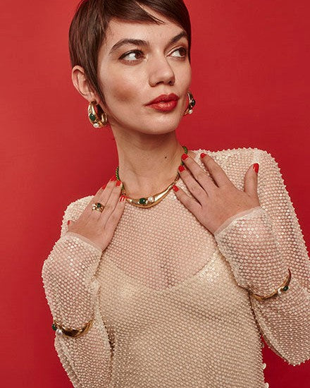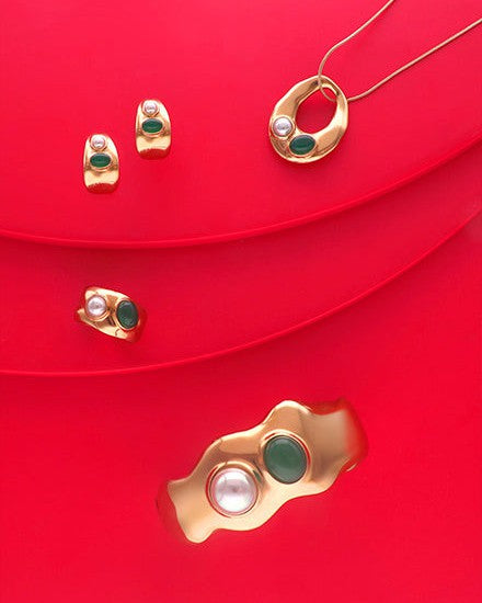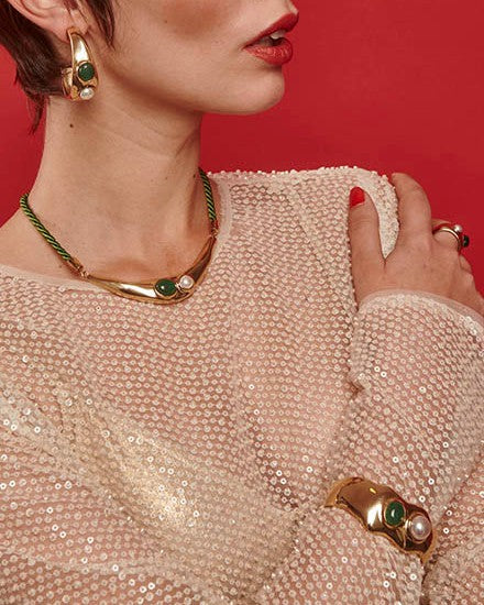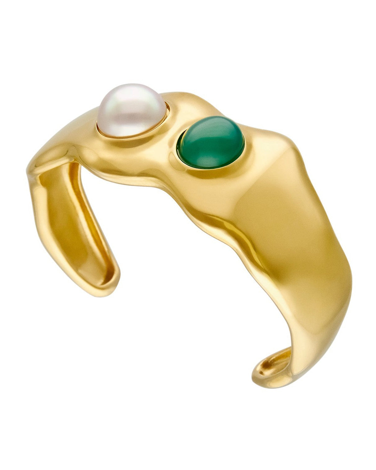 Wide bracelet in gold-tone steel with white half-ball pearl and green agate. Design meets strength.Wide bracelet in gold-tone steel with white half-ball pearl and green agate. Design meets strength.Wide bracelet in gold-tone steel with white half-ball pearl and green agate. Design meets strength.