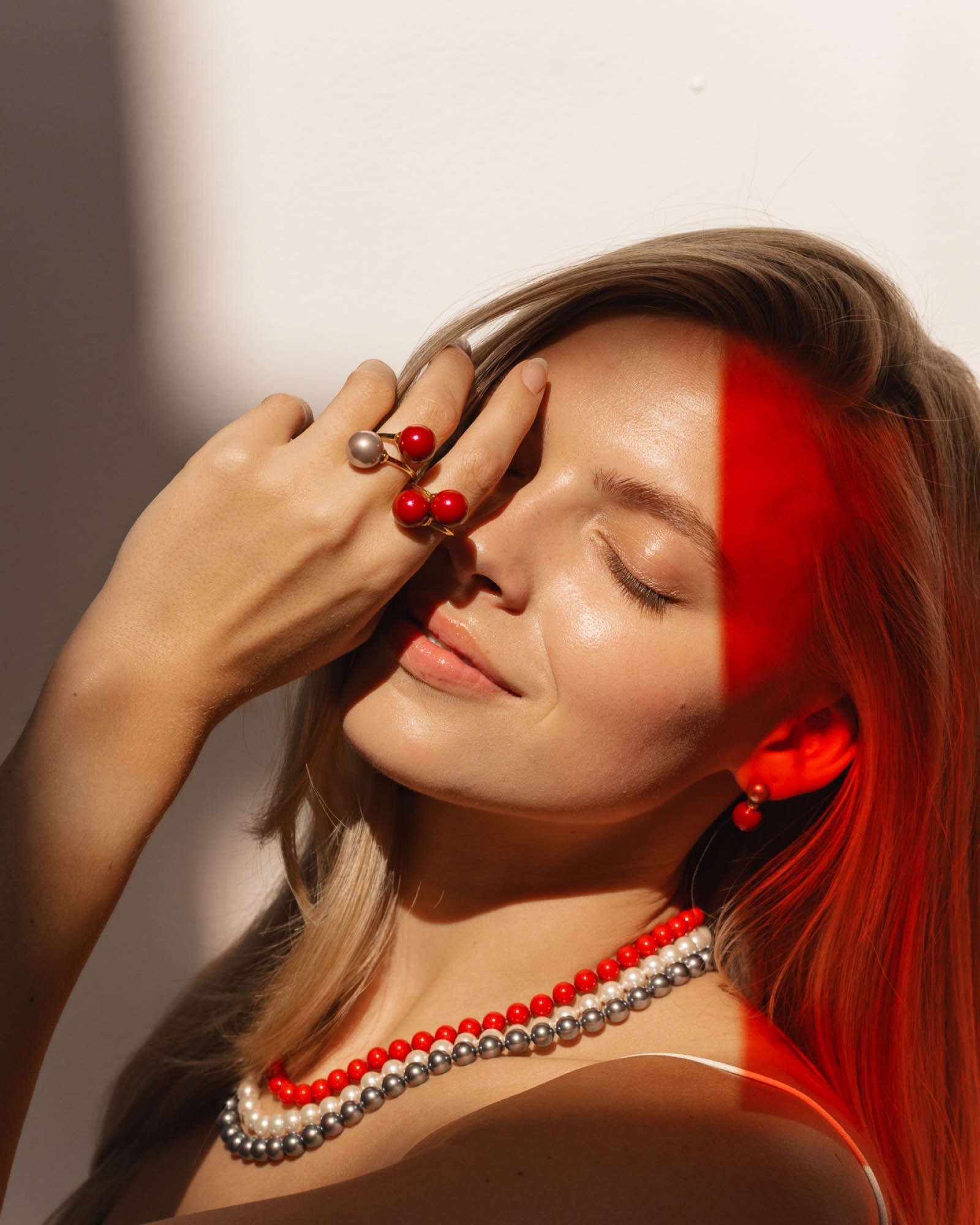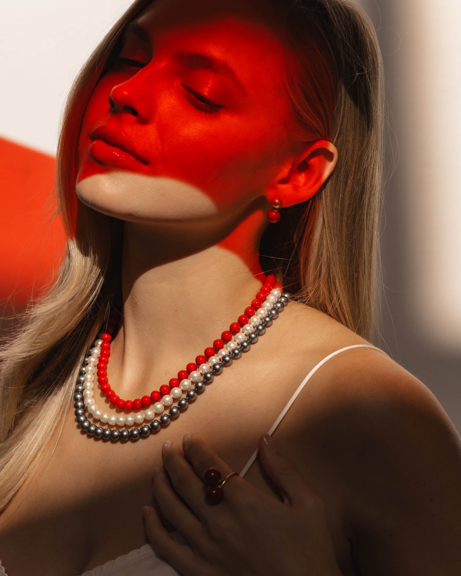 Three-strand necklace with 8mm round red, white and grey pearls. The king of pearls is the three-strand necklace