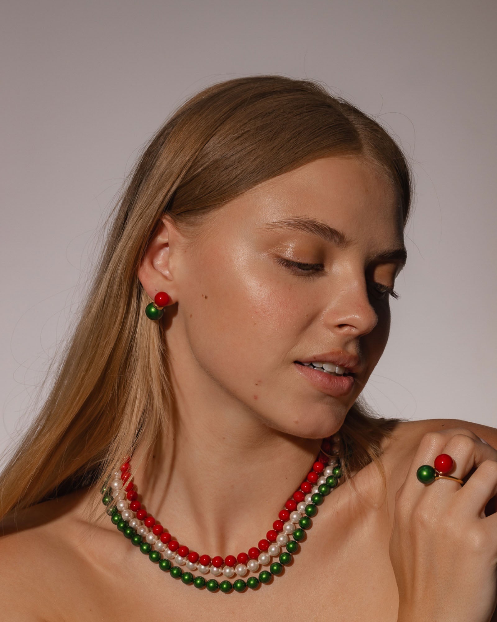 Three-strand necklace with 8mm round red, white and green pearls. The king of pearls is the three-strand necklace, with a length of 45cm. Elizabeth is Majorica's collection of three-strand pearl necklaces.Three-strand necklace with 8mm round red, white and green pearls. The king of pearls is the three-strand necklace, with a length of 45cm. Elizabeth is Majorica's collection of three-strand pearl necklaces.Three-strand necklace with 8mm round red, white and green pearls. The king of pearls is the three-strand necklace, with a length of 45cm. Elizabeth is Majorica's collection of three-strand pearl necklaces.
