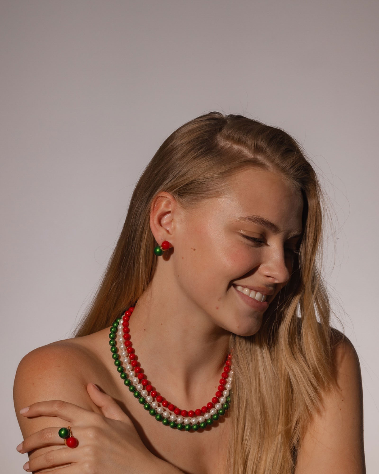 Three-Row Red, White and Green Pearl Necklace Elizabeth