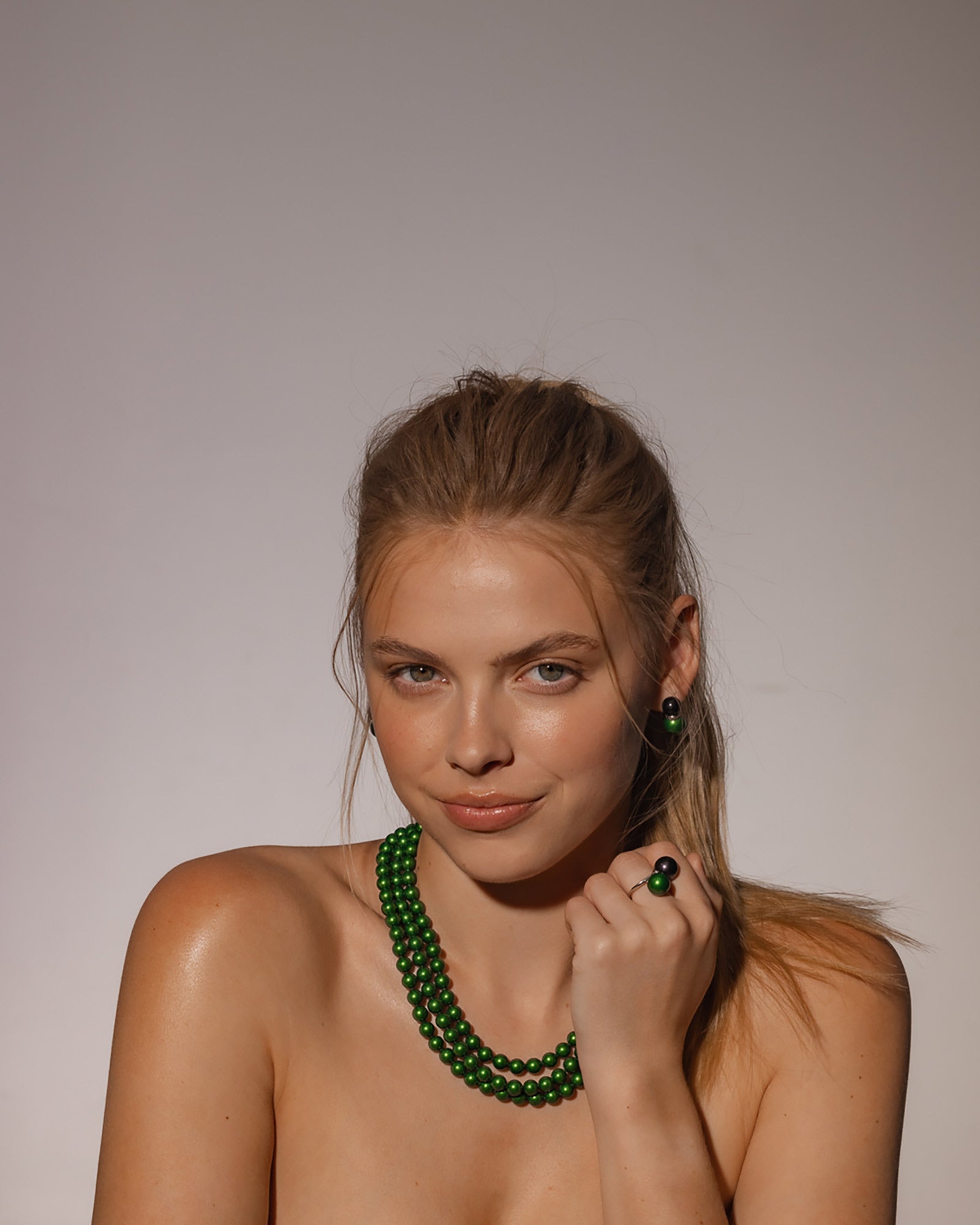 Three-strand necklace with 8mm green round pearl. The king of pearls is the three-strand necklace