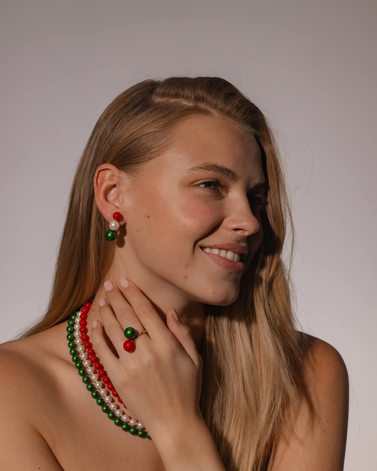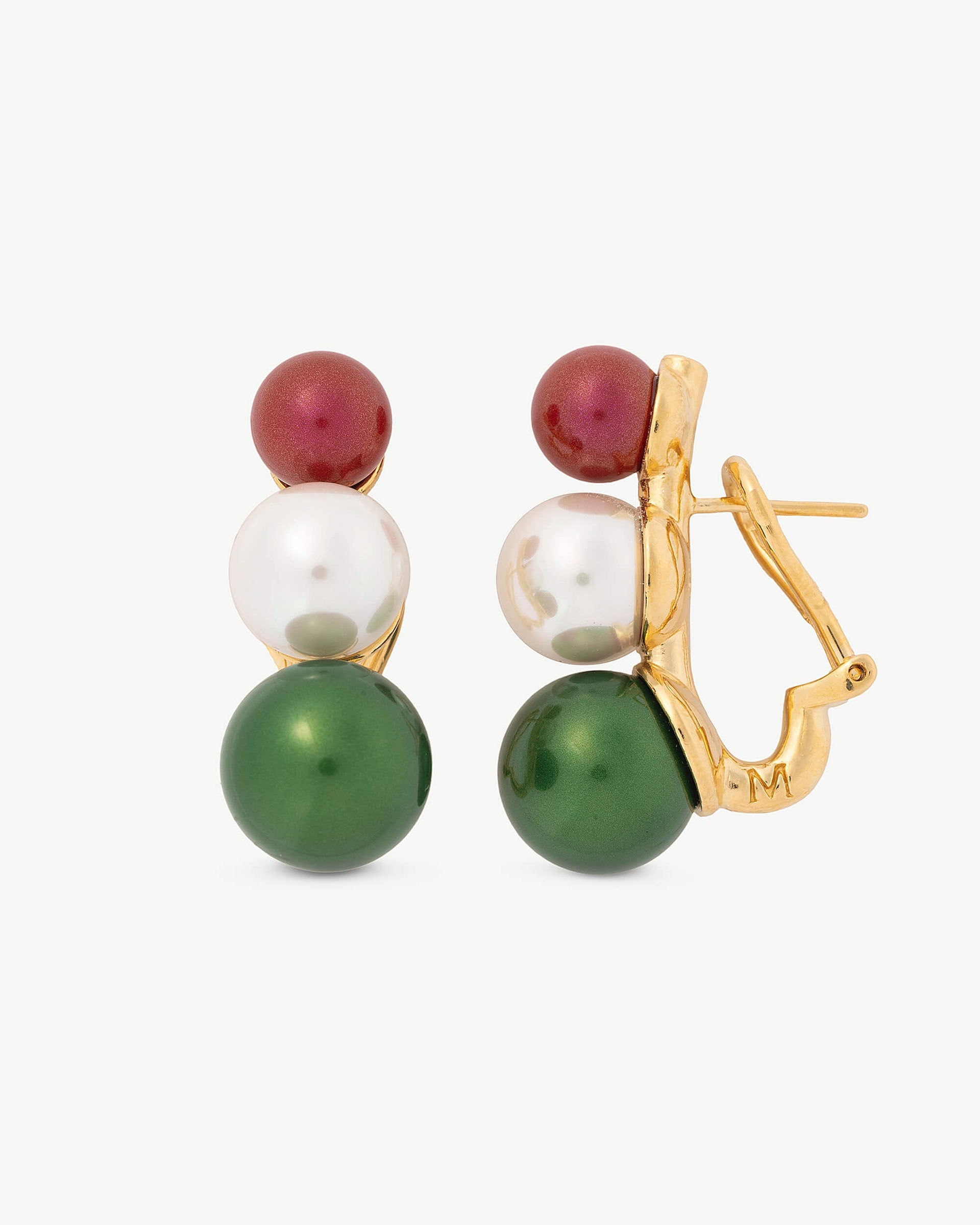 Golden silver earring with omega closure. Triple round red, white and green pearl of 8, 10 and 12mm. Combining pearls with each other in a particular way inspired by the 50s is fashionable.Golden silver earring with omega closure. Triple round red, white and green pearl of 8, 10 and 12mm. Combining pearls with each other in a particular way inspired by the 50s is fashionable.Golden silver earring with omega closure. Triple round red, white and green pearl of 8, 10 and 12mm. Combining pearls with each other in a particular way inspired by the 50s is fashionable.