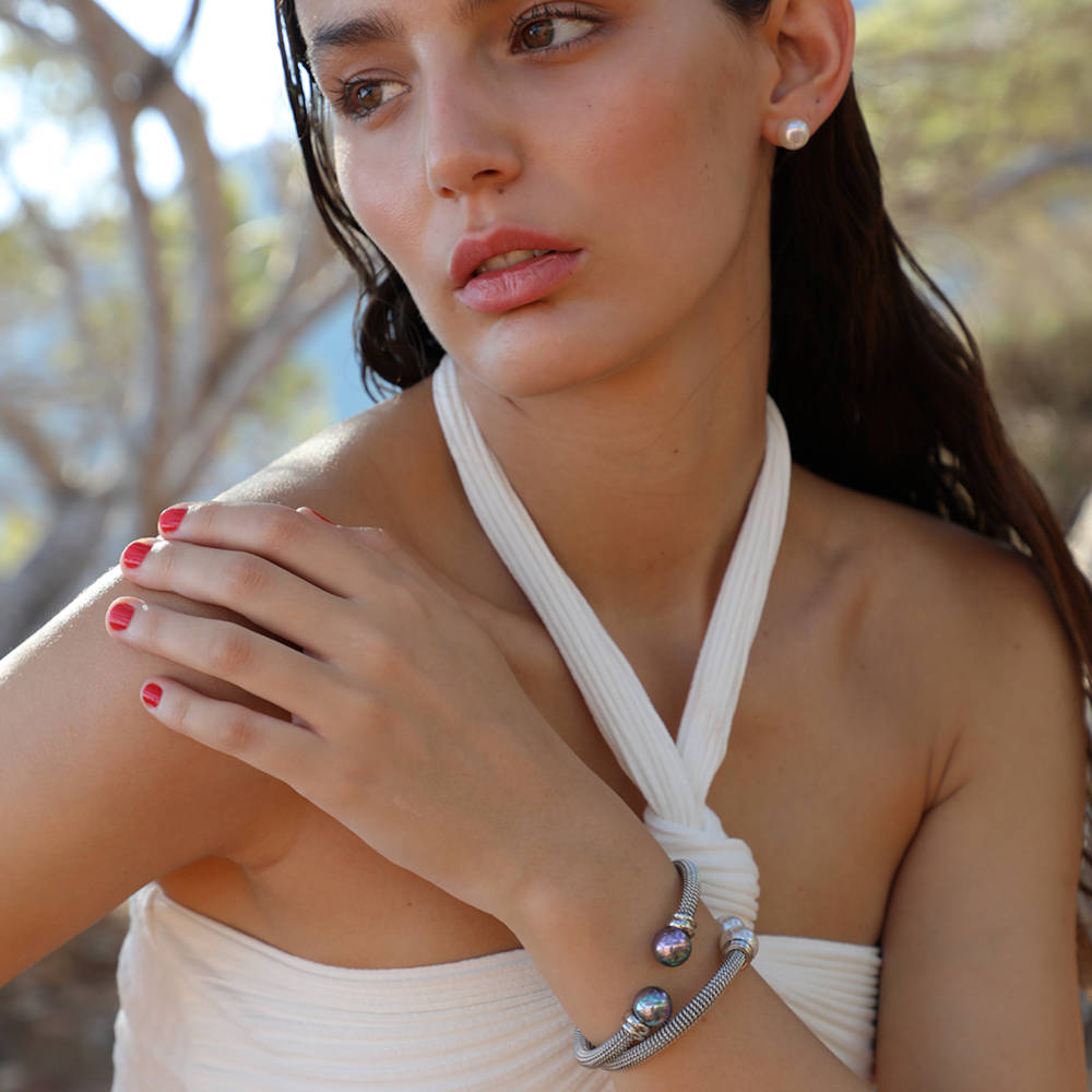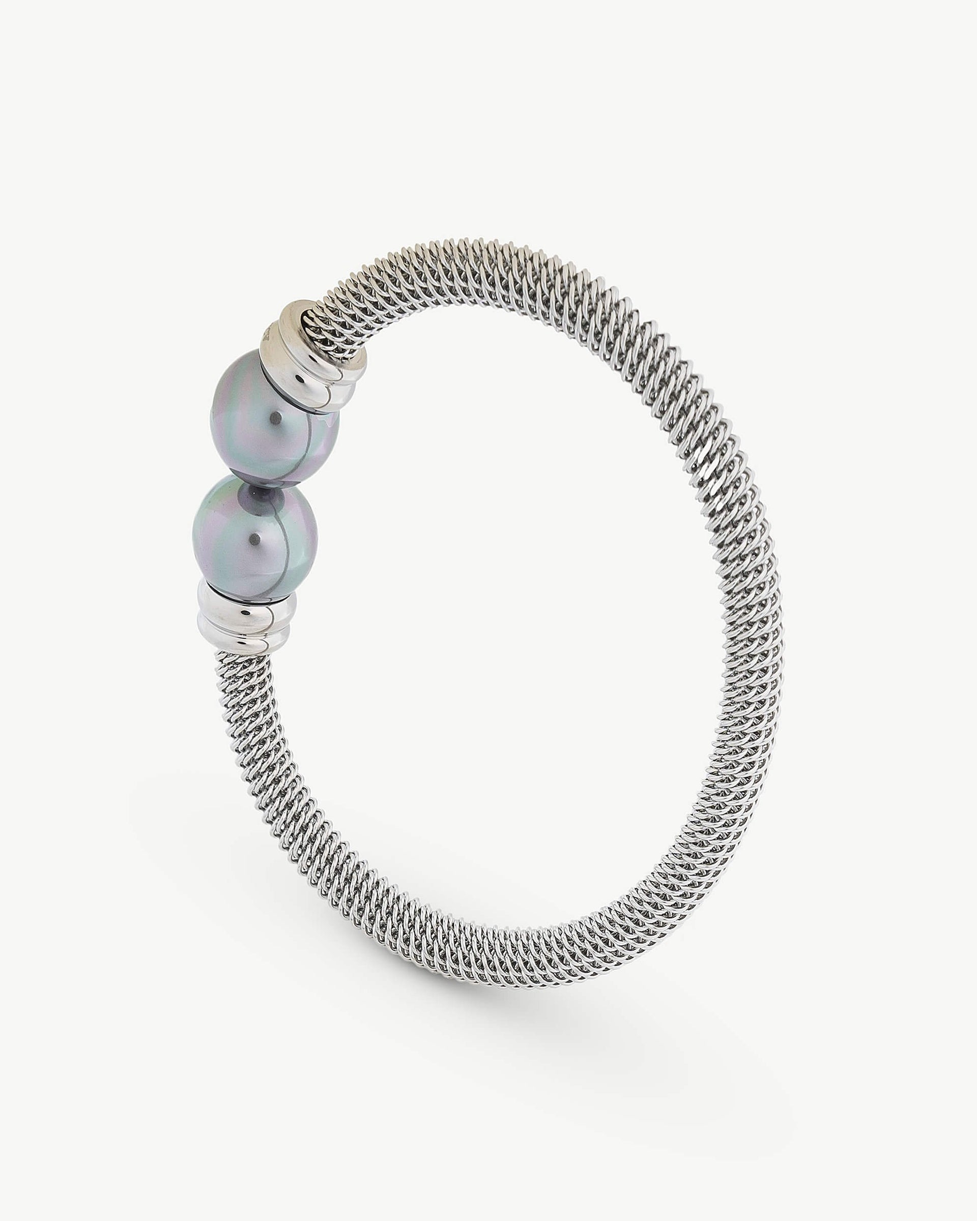 Rigid rhodium-plated steel bracelet, 12mm gray round pearls. For this collection of bracelets, rings and earrings, made of high-quality steel and adorned with pearls, each piece has been created to combine the sobriety of steel with the timelessness of pearls.Rigid rhodium-plated steel bracelet, 12mm gray round pearls. For this collection of bracelets, rings and earrings, made of high-quality steel and adorned with pearls, each piece has been created to combine the sobriety of steel with the timelessness of pearls.Rigid rhodium-plated steel bracelet, 12mm gray round pearls. For this collection of bracelets, rings and earrings, made of high-quality steel and adorned with pearls, each piece has been created to combine the sobriety of steel with the timelessness of pearls.