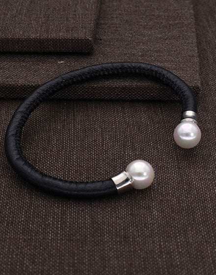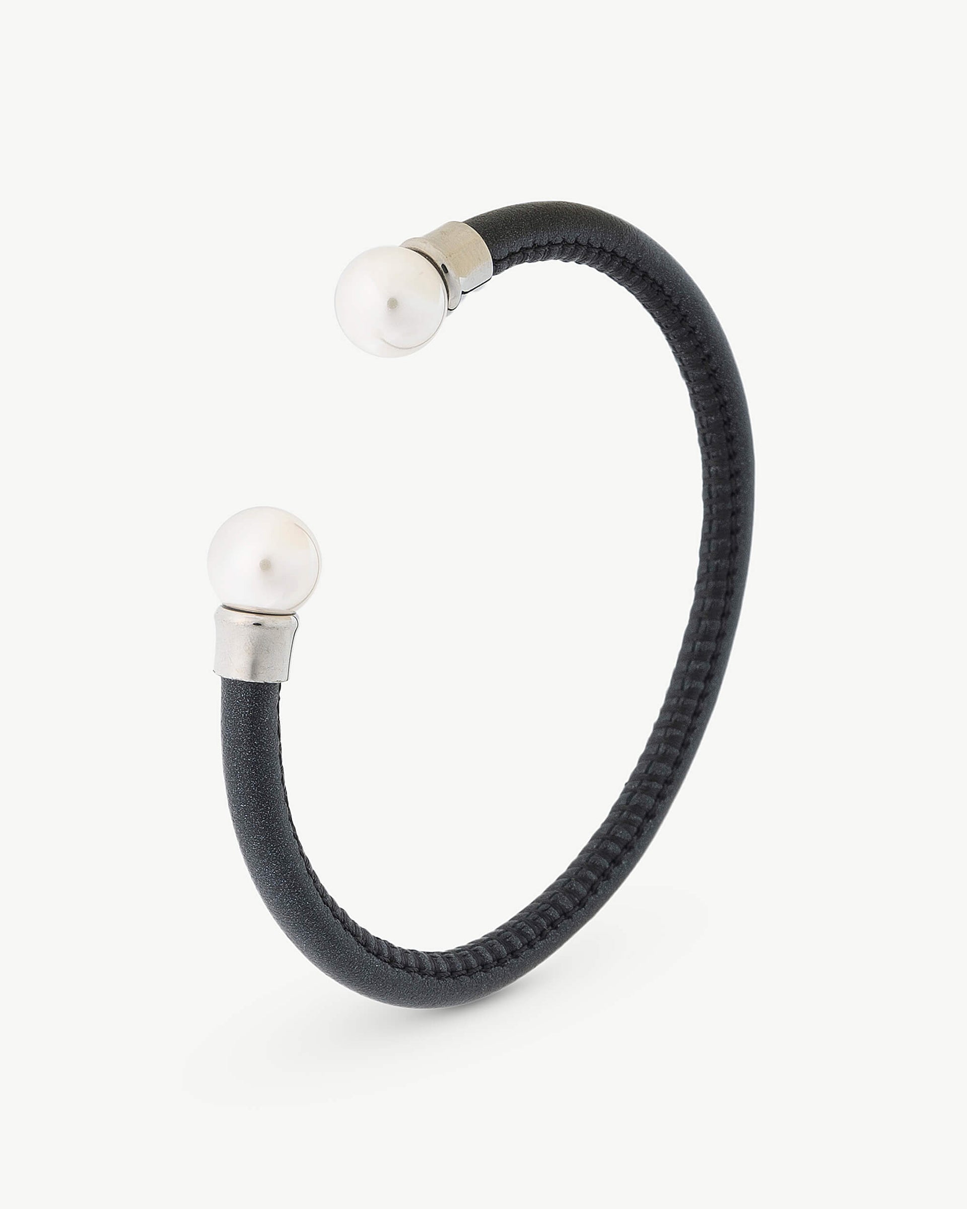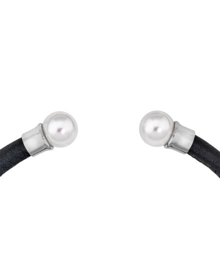 Rigid bracelet with black leather measuring 44cmx53cm in steel, 8mm white round pearls.