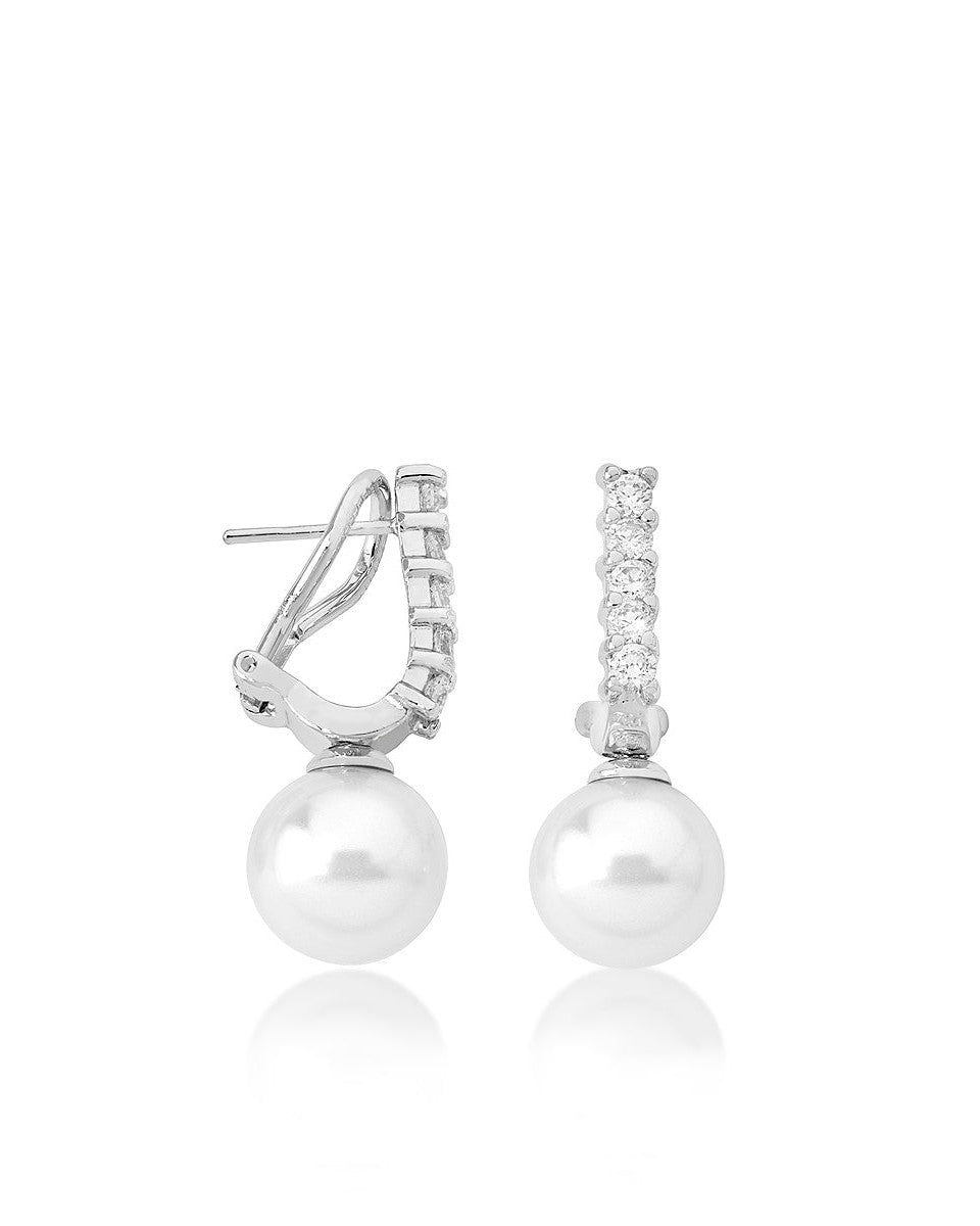 Long spiked omega earrings in rhodium-plated silver, 12mm white round pearls and zircons. The perfect collection makes it the perfect couple.