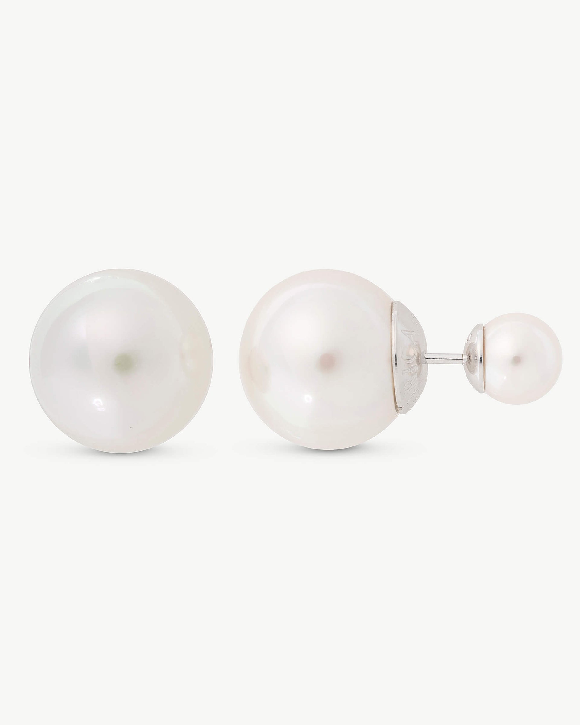 Double spiked ball earrings in rhodium-plated silver, 816mm white round pearls. gives its name to a collection of double Majorica pearl earrings.