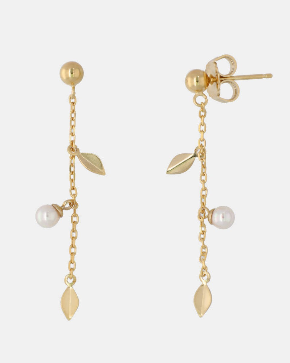Long earrings with a 4.8cm long spike in golden silver, 4mm white round pearl. Floral motifs shape the golden silver of this jewelry collection, where the pearls shine and are linked with the delicate chains and leaf-shaped patterns.Long earrings with a 4.8cm long spike in golden silver, 4mm white round pearl. Floral motifs shape the golden silver of this jewelry collection, where the pearls shine and are linked with the delicate chains and leaf-shaped patterns.Long earrings with a 4.8cm long spike in golden silver, 4mm white round pearl. Floral motifs shape the golden silver of this jewelry collection, where the pearls shine and are linked with the delicate chains and leaf-shaped patterns.