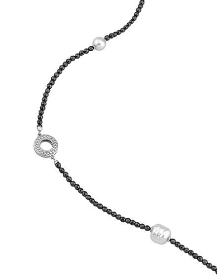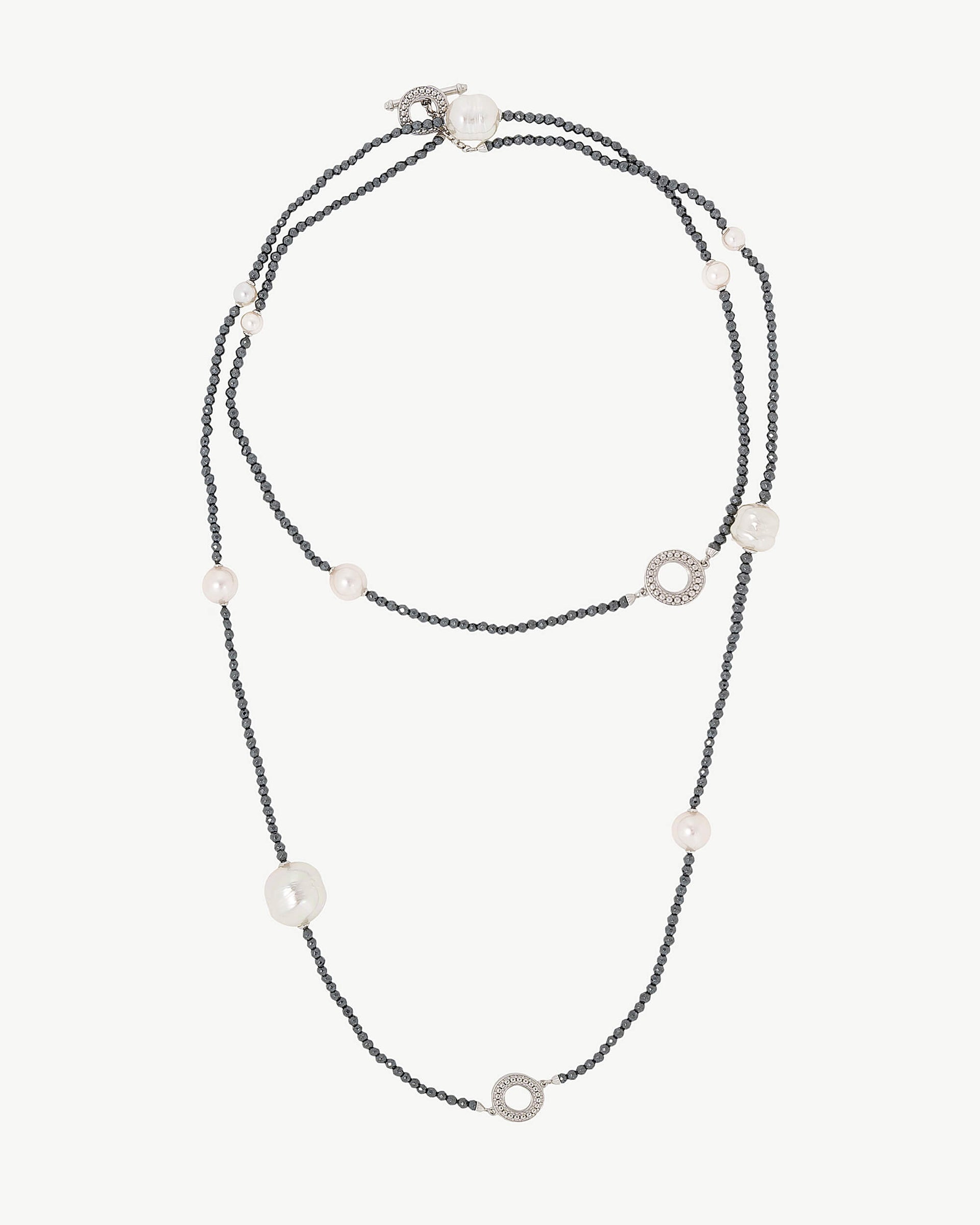 120cm long necklace in rhodium-plated silver, 816 white round and baroque pearls and hematite.