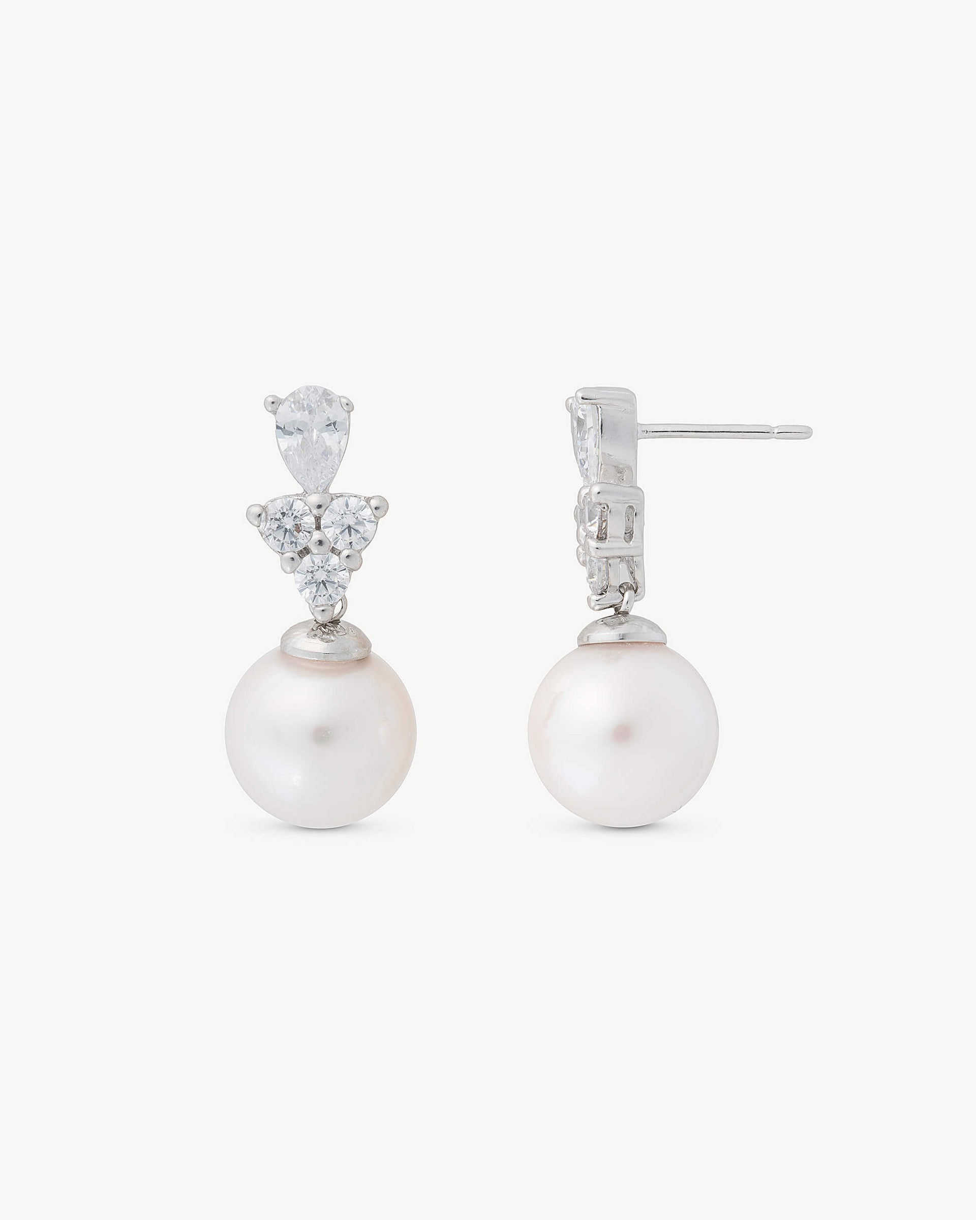 Short spike earrings in rhodium-plated silver, 10mm white round pearls and zircons. The combination of pearls and zircons in the collection is suitable for romantic styles that seek simplicity, although always with the elegance and perfection of the brilliance that the set Zircons give to each of these jewels.Short spike earrings in rhodium-plated silver, 10mm white round pearls and zircons. The combination of pearls and zircons in the collection is suitable for romantic styles that seek simplicity, although always with the elegance and perfection of the brilliance that the set Zircons give to each of these jewels.Short spike earrings in rhodium-plated silver, 10mm white round pearls and zircons. The combination of pearls and zircons in the collection is suitable for romantic styles that seek simplicity, although always with the elegance and perfection of the brilliance that the set Zircons give to each of these jewels.
